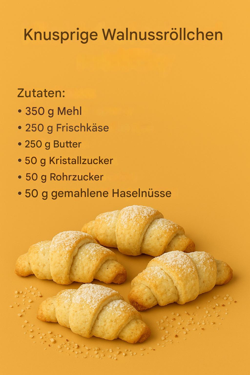 In 16 Dreiecke teilen. Zur Spitze hin aufrollen, sodass ein kleines Croissant entsteht. Mit dem restlichen Teig ebenso verfahren. Auf ein mit Backpapier ausgelegtes Backblech legen. 12–15 Minuten bei 180 Grad backen.Teile dieses Rezept für Shortbread-Brötchen mit Nussfüllung mit deinen Freunden! Sie werden es bestimmt auch genießen!