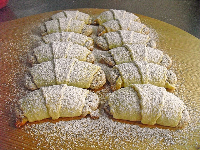 Jede Kugel mit Mehl (man braucht schon noch eine etliche Menge an Mehl) hauchdünn ausrollen (das ausgerollte Stück kann ganz ungleichmäßig sein). Mit einem normalen Messer etwas von der Füllung darauf verteilen und durch Anheben eines Zipfels des Teiges locker aufrollen. Auf ein Mit Backpapier ausgelegtes Blech legen. Auf ein rechteckiges Blech passen etwa 18 Hörnchen. Ich backe immer bei Heißluft etwa 160 Grad 20 Minuten. Sie sollen schön hell bleiben. Sie gehen beim Backen luftig auf.