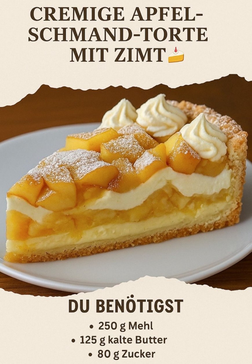 Die Kombination aus buttrigem Mürbeteig, einer fruchtig-zimtigen Apfelschicht und einer sanft gebackenen Creme macht diesen Kuchen zu einem echten Genuss für alle Sinne. Während die Äpfel mit Zimt und Zitronensaft leicht karamellisieren und ihre Süße entfalten, sorgt der Schmand für eine angenehm frische Note, die perfekt mit der Sahne harmoniert. Nach dem Backen entwickelt sich eine zarte, leicht goldene Oberfläche, die – mit etwas Puderzucker bestäubt – beinahe wie von Frost überzogen wirkt.