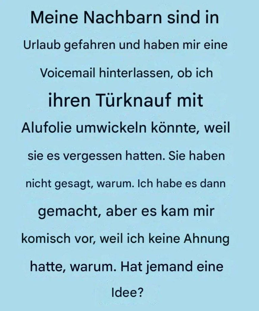 Als meine Nachbarn im Urlaub waren, hinterließen sie mir eine Voicemail-Nachricht mit der Frage, ob ich ihren Türgriff mit Alufolie umwickeln könnte.