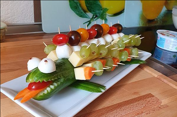 Das Rezept kommt bei Kids gut an und kann in den Zutaten je nach Geschmack verändert werden, z.B. Cocktailwiener und eine Weintraube oder was man sonst gern mag auf die Spieße stecken. Ich gebe das an Geburtstagen auch gern mit in den Kindergarten, statt Kuchen.