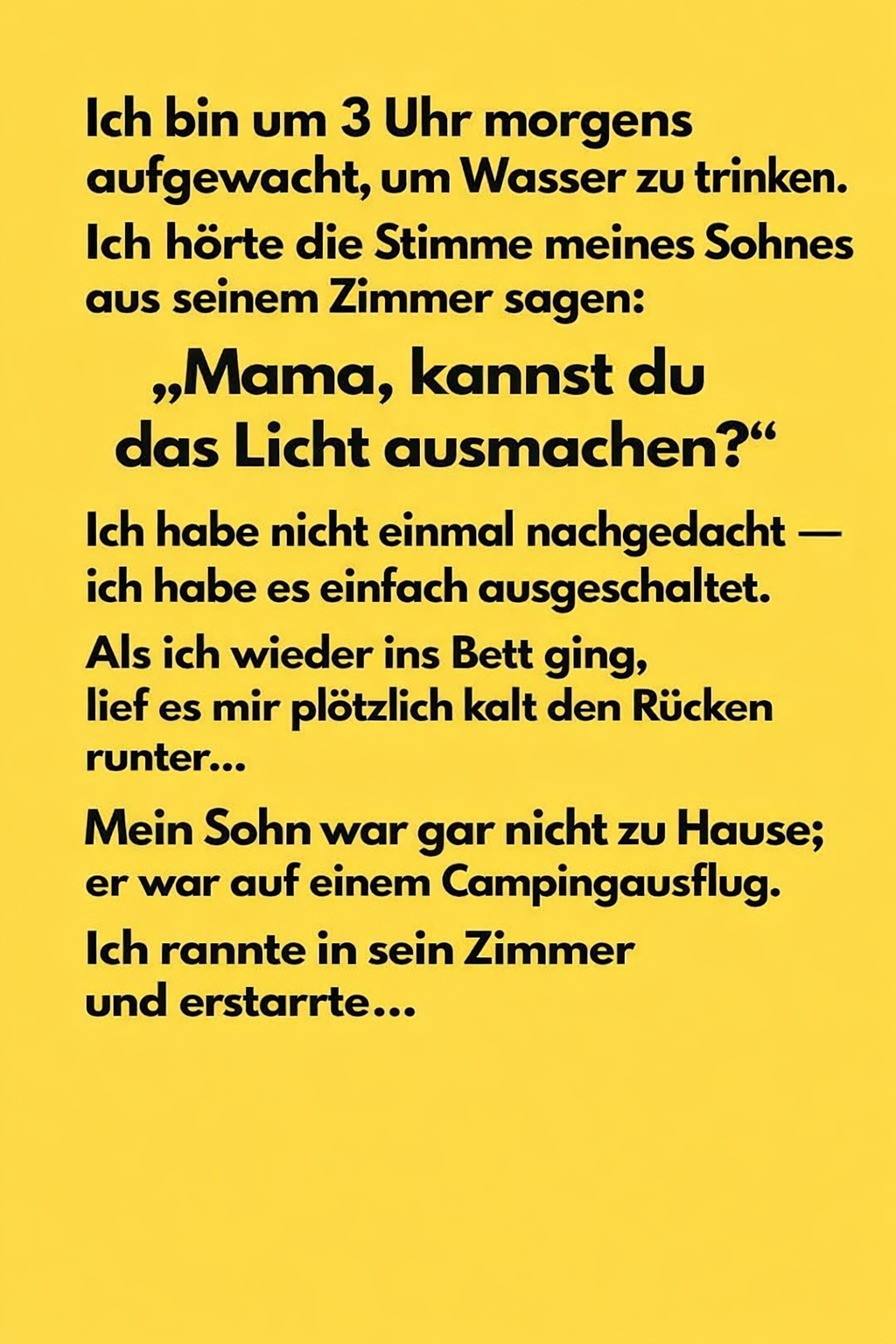Ohne nachzudenken, ganz automatisch, wie schon so oft zuvor, drehte ich mich um und schaltete das Licht in seinem Zimmer aus. Die Stimme war so real, so vertraut… ich hatte keinen Moment lang Zweifel.