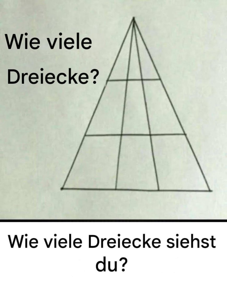 Zusammenfassung: Begeistern Sie sich für visuelle Rätsel und Denksportaufgaben, die Ihre Logik herausfordern? Dann betrachten Sie dieses Bild genauer. Es wirkt einfach: ein großes Dreieck, unterteilt durch horizontale und vertikale Linien. Doch die Frage ist viel schwieriger als sie scheint: Wie viele verschiedene Dreiecke können wir in dieser Figur tatsächlich zählen? Die meisten Menschen liegen falsch, weil unser Gehirn nicht alle Details auf den ersten Blick erfasst. Und doch ist die Antwort tatsächlich da! Hier erfahren Sie, wie Sie diese optische Täuschung entschlüsseln und die Lösung finden. Sehen Sie selbst: Warum verwirrt uns dieses Bild so sehr?