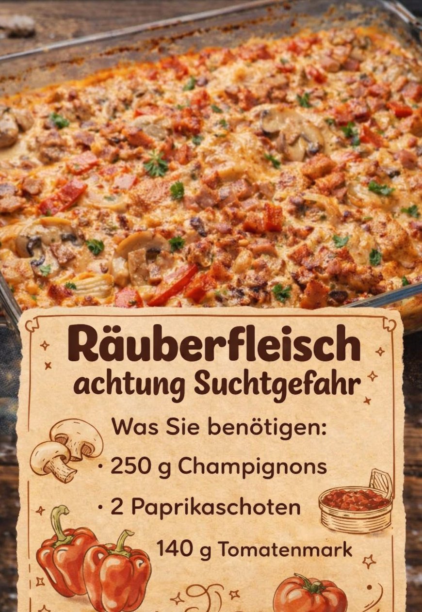 wecken schon beim ersten Duft Erinnerungen an gemütliche Abende, volle Teller und zufriedene Gesichter am Tisch. Räuberfleisch gehört genau zu diesen Rezepten. Es ist herzhaft, würzig und angenehm cremig – ein Ofengericht, das ohne viel Aufwand auskommt, aber geschmacklich richtig Eindruck macht. Während das Fleisch langsam gart, verbindet sich die pikante Sauce aus Paprika, Champignons, Gewürzgurken und Tomatenmark zu einer intensiven, vollmundigen Komposition, die einfach Lust auf mehr macht.