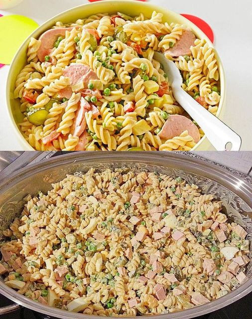 Nun die abgekühlte Nudel-Erbsen-Mischung, die Wurstwürfel, den Käse, die Tomaten, die Gurkenscheiben und die Soße in eine große Schüssel geben. Alles gut vermengen, sodass die Soße gleichmäßig die Zutaten bedeckt.