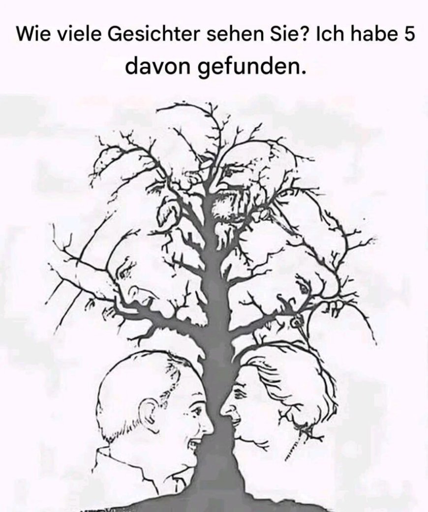 Auf den ersten Blick sieht man nur einen Baum. Vielleicht entdecken Sie ein Gesicht, vielleicht zwei. Doch je länger Sie hinschauen, desto mehr beginnt dieses Bild, Ihr Gehirn herauszufordern. Was zunächst wie eine einfache Illustration wirkt, entpuppt sich als raffinierte optische Täuschung, die Wahrnehmung, Aufmerksamkeit und Vorstellungskraft auf die Probe stellt. Genau darin liegt der Reiz dieses geheimnisvollen Werkes: Es lädt Sie ein, genauer hinzusehen, Details zu hinterfragen und verborgene Formen zu entdecken, die nicht jeder sofort erkennt. Manche sehen nur wenige Gesichter, andere plötzlich viele – und genau hier beginnt das spannende Spiel zwischen Auge und Verstand.