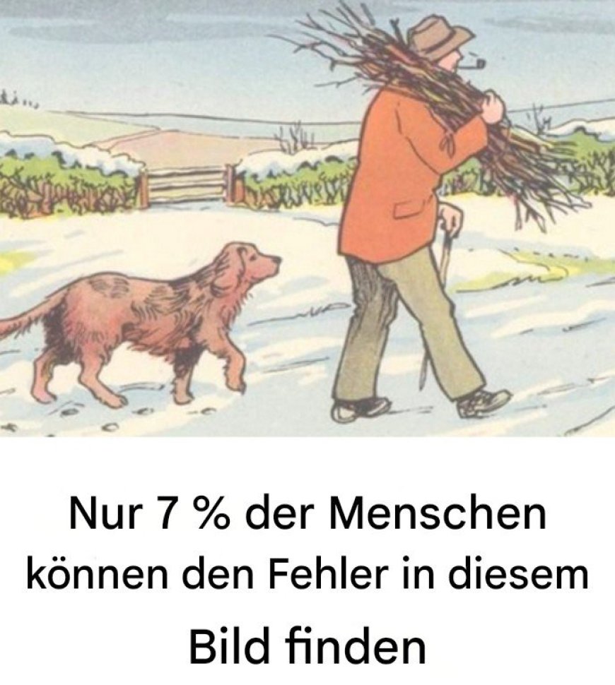 Auf den ersten Blick wirkt alles ganz normal: Ein Mann geht mit seinem Hund durch eine verschneite Landschaft, die Umgebung ist ruhig, fast idyllisch. Doch genau hier liegt die Herausforderung. In dieser scheinbar harmlosen Zeichnung hat sich ein Fehler versteckt – ein Detail, das nicht in das Gesamtbild passt. Die meisten Menschen übersehen es, weil ihr Blick zu schnell über das Bild gleitet.